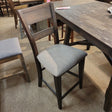 Gather the family around the Double Bridge table set, consisting of the trestle table and four splat back counter chairs. Crafted of rubberwood solids and acacia veneers, this kit features a dark chestnut finish with wire brushing. The table offers two 12-inch leaves, one for each end of the table, to accommodate guests or a larger family, and an easy glide track system for added convenience. The chairs feature grey linen upholstery on the seats and nylon chair glides to protect your flooring. The Double Bridge Dining defines the rustic side of casual. The sleek design is optimal for any space.