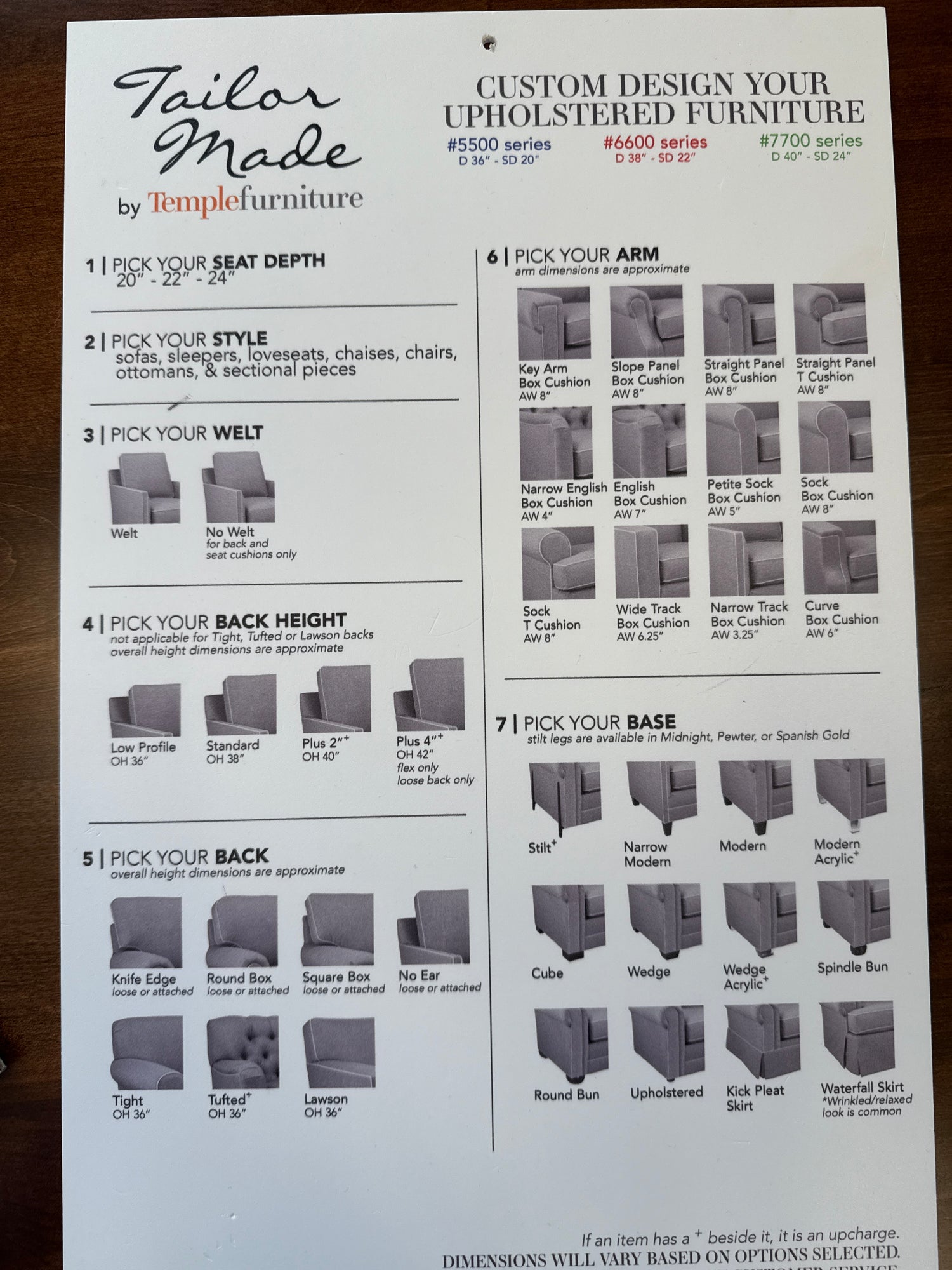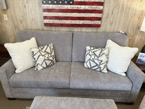 Expertly designed for taller individuals, this sofa boasts a taller back and deeper seat. This 2 seat sofa from Taylor Made Group is made with high-quality Ciao Mercury fabric and features two stylish pillows - one measuring 20 inches and the other 24 inches. You can also upgrade to the Sheldon Ivory fabric and add 4 inches to the seat height for maximum comfort. The Flexback back/seat cushions provide additional support, and the piece is constructed with 8-way hand-tied methods, ensuring durability. As part of our fully customizable program, you have the freedom to select your preferred arm style, size, and cushion comfort. Proudly made in the USA with a box-type track arm and Brownstone cube feet, this sofa is perfect for those seeking both style and functionality.
