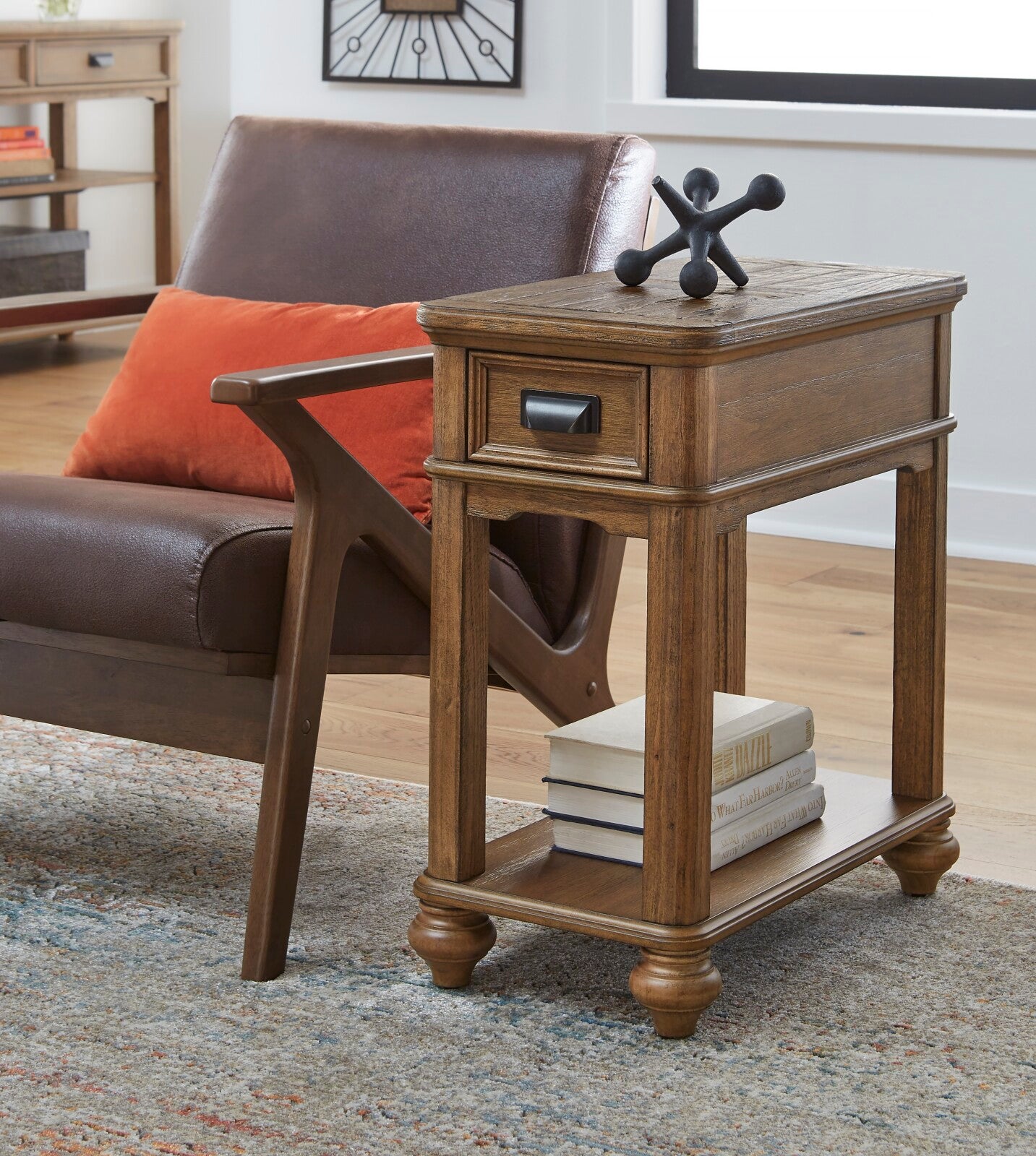 Traditional with a Cottage influence highlighted by straight legs with a smooth radius coupled with turned bun feet. Combine this with appealing details on the drawer fronts and the result is a look that works well in any home. A six piece collection in a Pecan Finish over Poplar solids and Birch veneers. Framed planked tops are textured and beautifully aged. Hand padded mineral metal cup drawer pull. Two cocktail sizes to fit any size room.