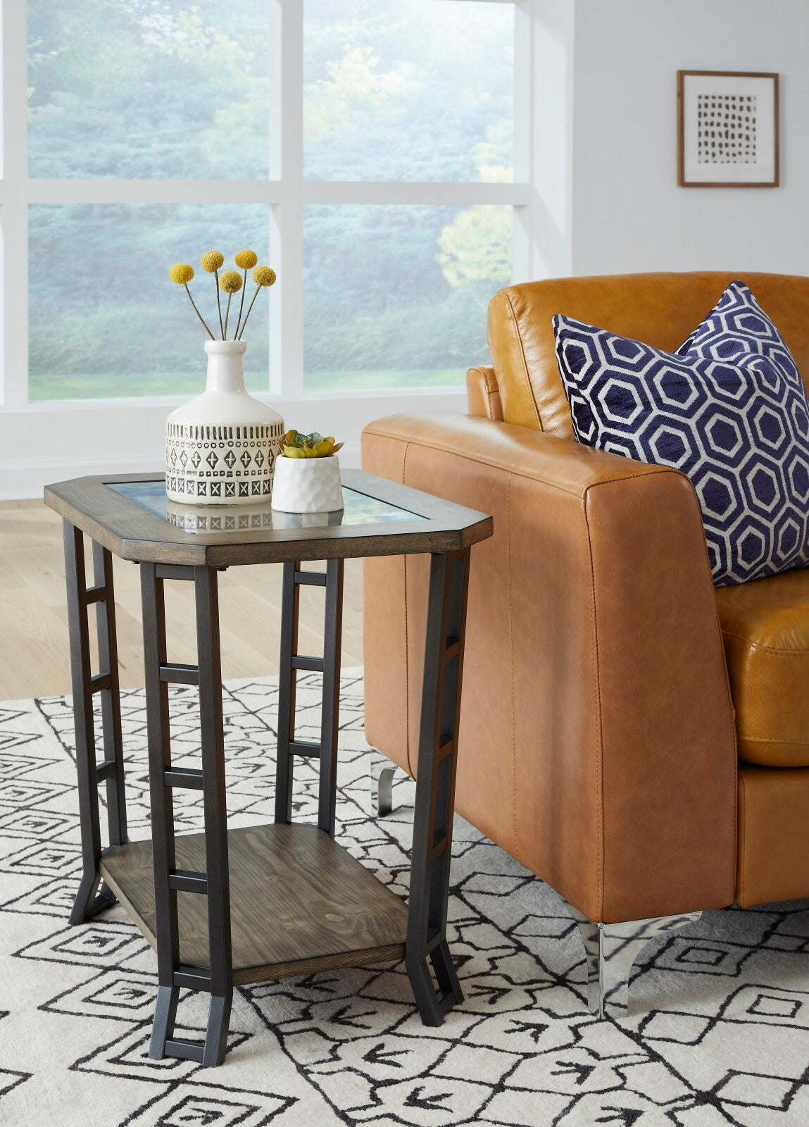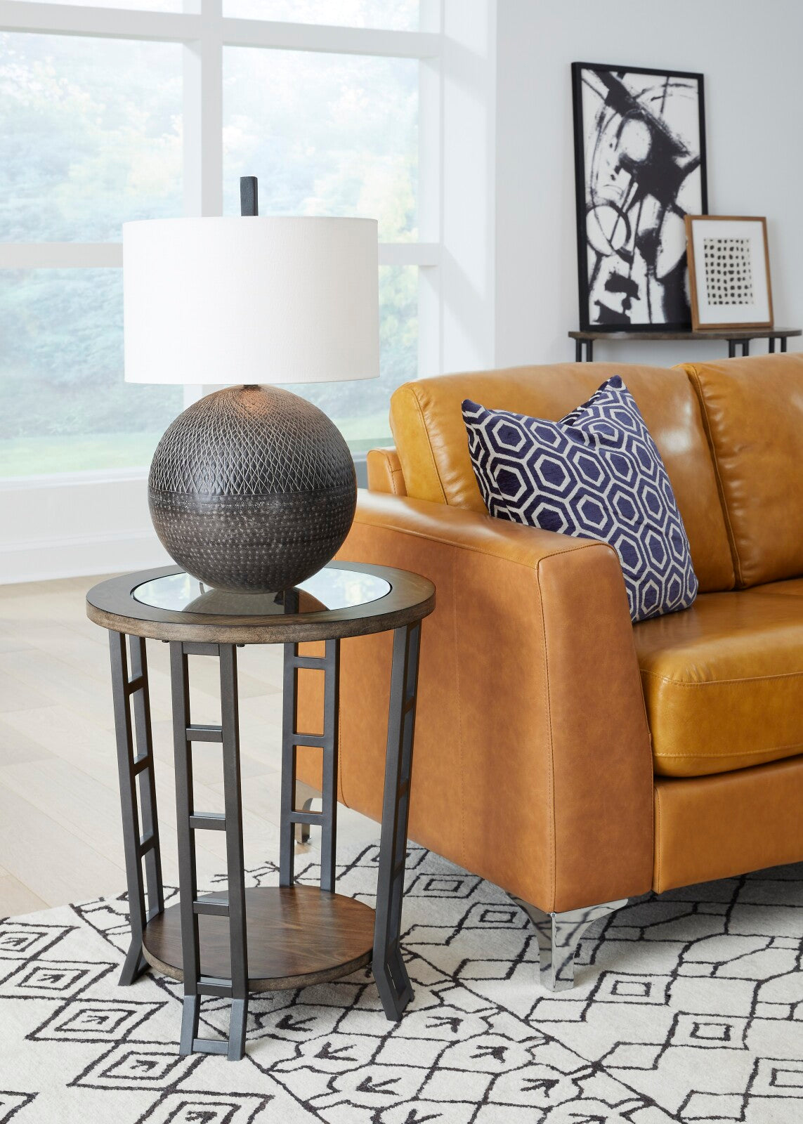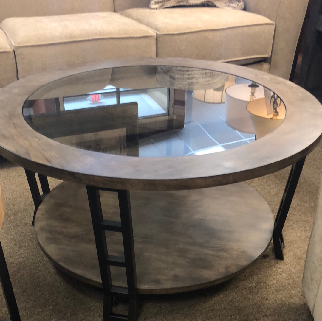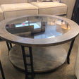 Round and rectangle contemporary forms utilizing gray glass inserts and angular textured metal bases. This collection is comprised of five tables with shelves for storage. The architectural vertical and horizontal elements of the legs give a structural feel while the angles are geometrically pleasing. Constructed with cedar veneer. The wood finish is weathered pine and metal legs are bronze.