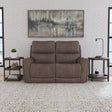 Power up and enjoy secretive perks with the Carter power reclining loveseat. Customize your comfort with adjustable recline, headrest and lumbar support on both seats, including reclining to a Zero Gravity position for a weightless experience, reducing pressure on joints. This loveseat will be a statement in your home with its genuine leather look that is a durable, easy to clean fabric in a cappuccino brown color, and Flexsteel's patented Blue Steel Spring™ at the heart of each seat for ultimate durability. Flared arms, a contoured seats and heavy thread stitching details give it a sleek, yet striking look. And it all comes with pop-out cupholders in the arms for discreet storage.