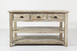 The Artisan's Craft End Table by Jofran offers a distressed look you will love. It features three drawers and one low open shelf in a casual style. It is crafted from wood solids in a Washed Grey finish and will fit to any living room.