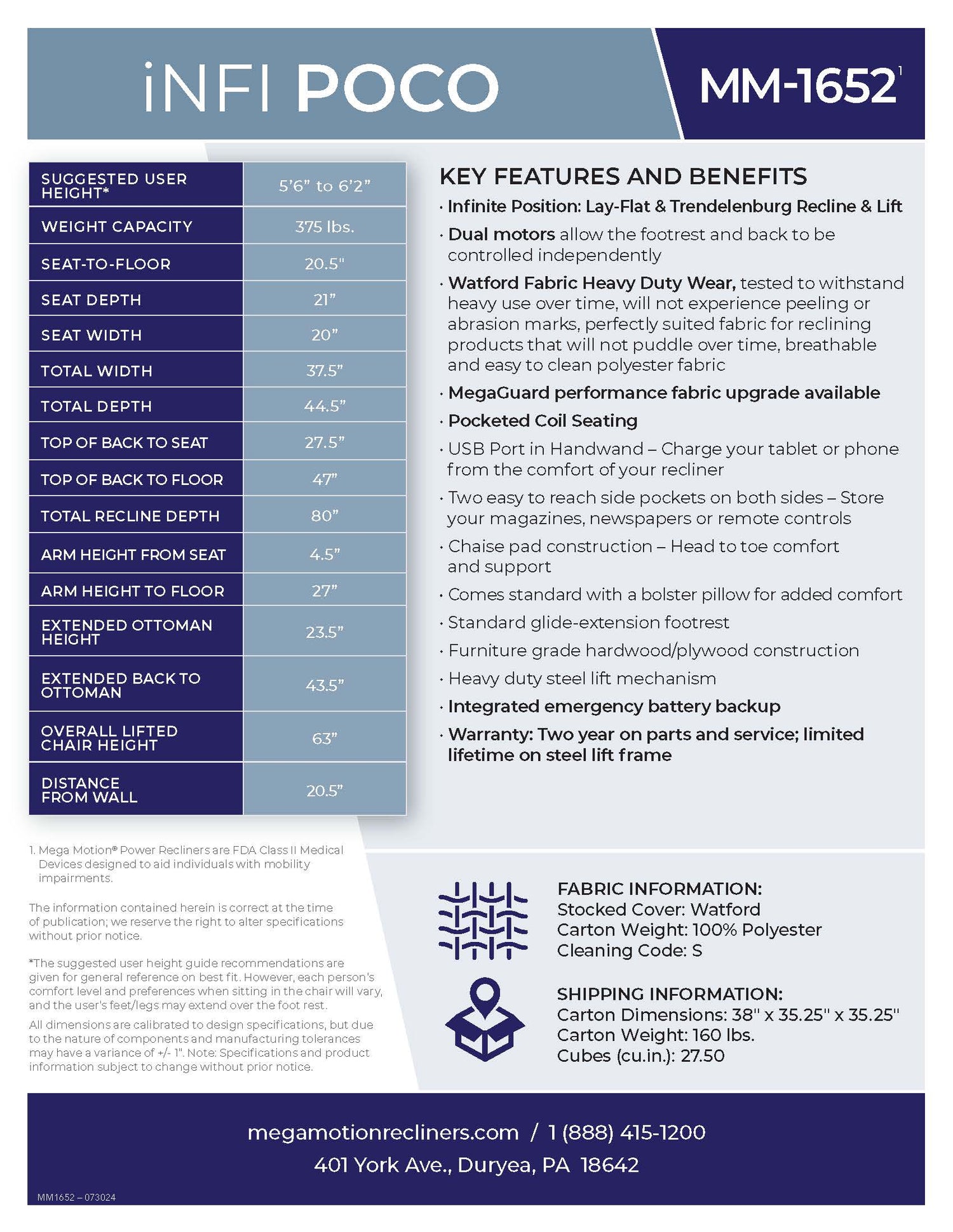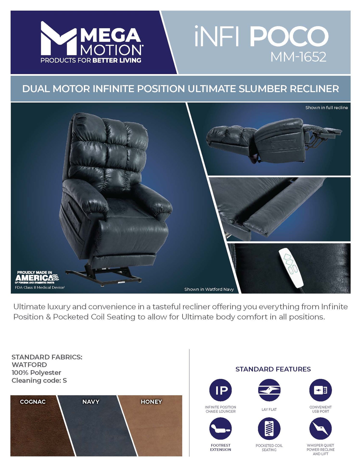 An infinite position power recliner with features galore, the MM-1652 is a welcome addition to any living room. The 49 foam encapsulated pocketed coils in the seat allow for ultimate body comfort. A deluxe heat and massage upgrade is available, as are MegaGuard® performance fabrics for luxurious relaxation every time. Proudly made in the USA, the MM-1652 has something to offer everyone.
