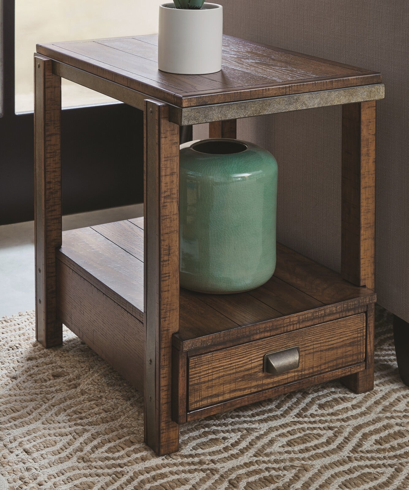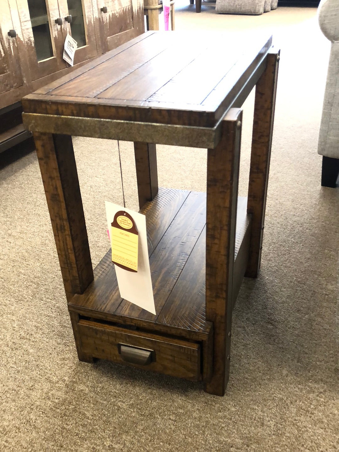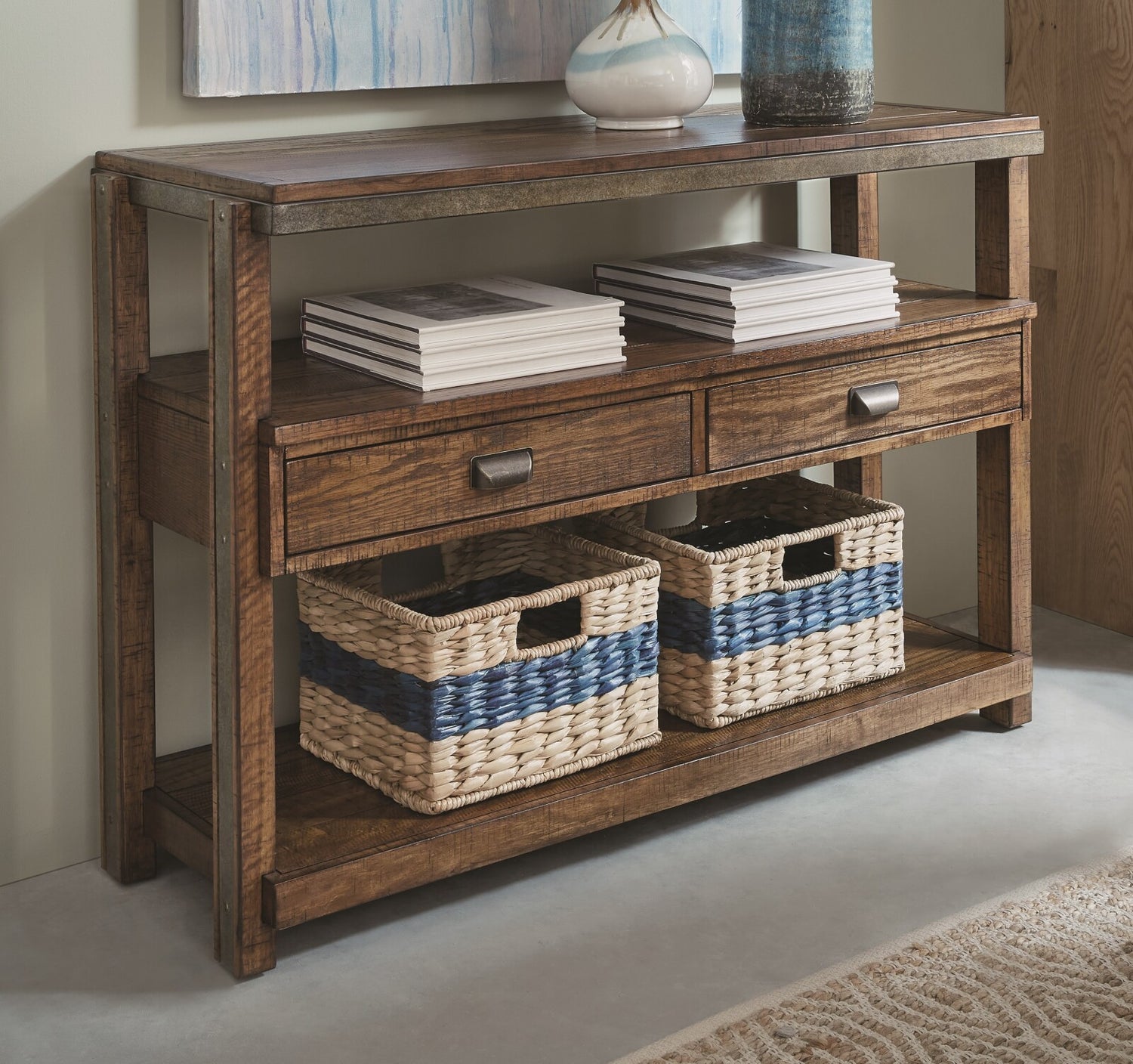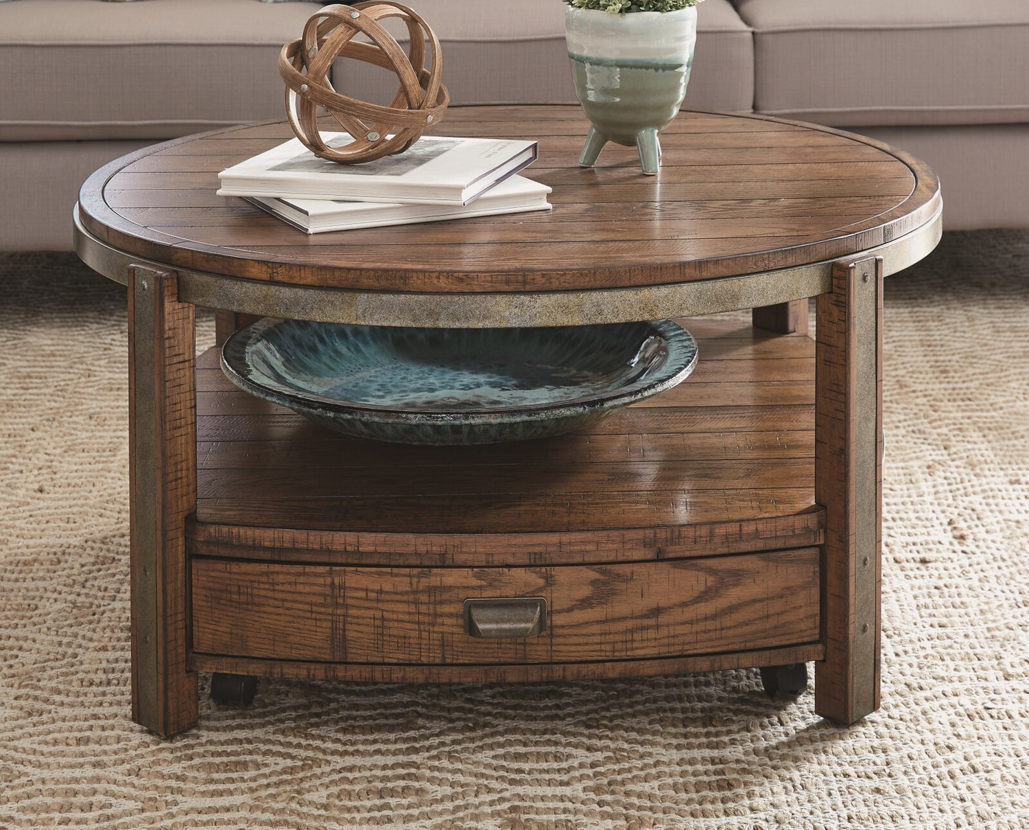 This collection consists of seven tables with functional design and storage built into each piece. Included is a rectangular cocktail table and a round cocktail table, both with casters providing easy mobility. With this collection, we continue to focus and build on the demand for round cocktail tables in the marketplace. Oak veneer tops in a distressed Umber finish with aged antique brass metal are features that bring a rustic, charming feel to the group.