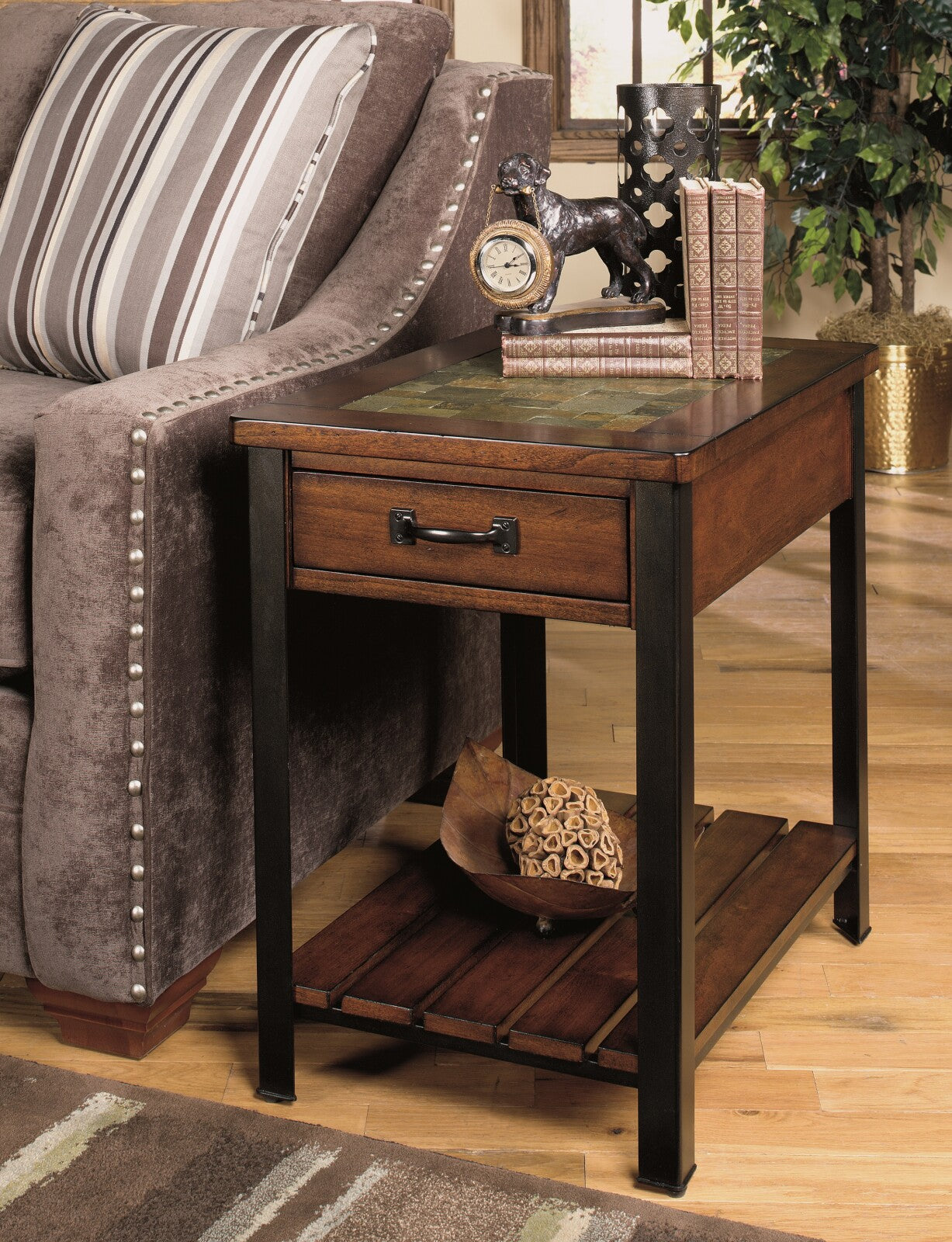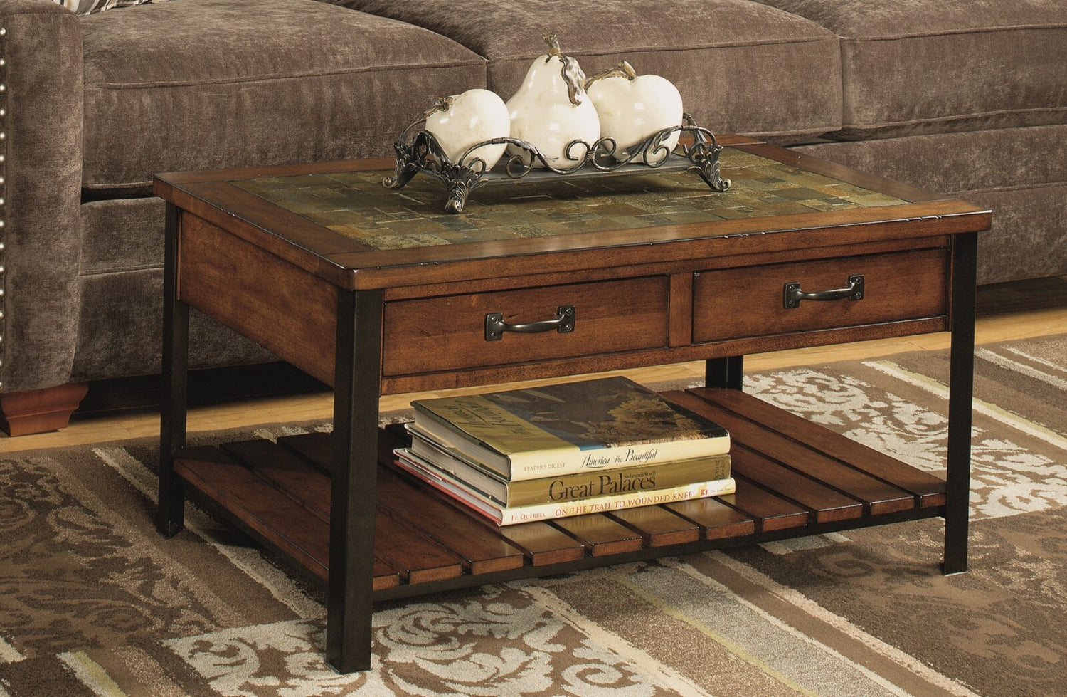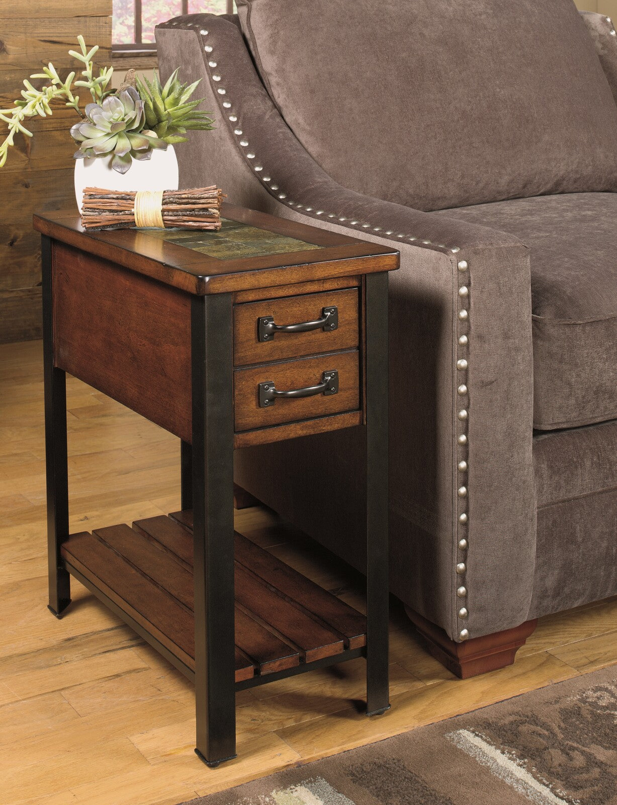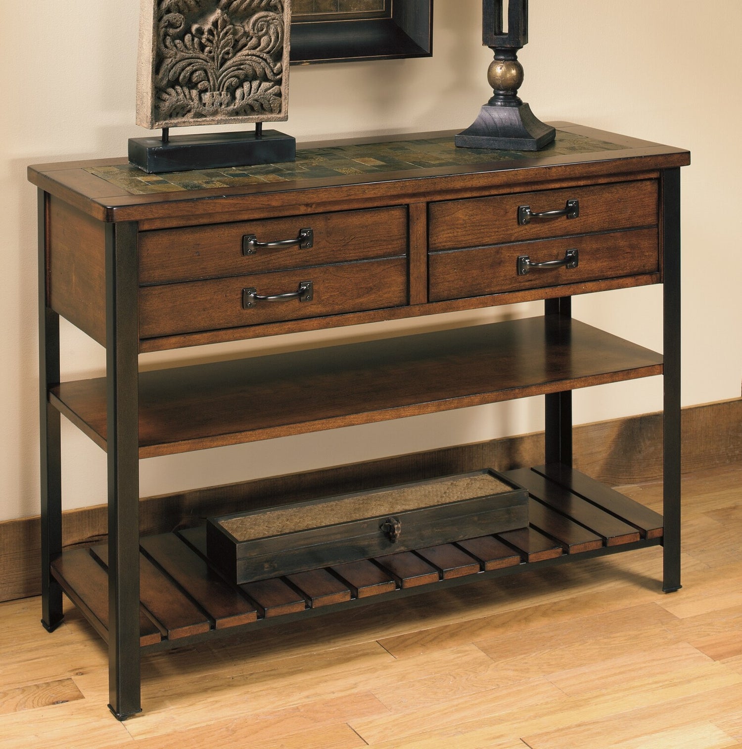 This collection is comprised of five table with plenty of storage and function designed into each piece. The cherry veneer is expertly finished with an aged tobacco finishing process that is further enhanced by natural slate tile tops and antique bronze metal legs and hardware. The slatted shelves on selected pieces only add to the style and function of this group to offer a major occasional fashion option to any consumer.