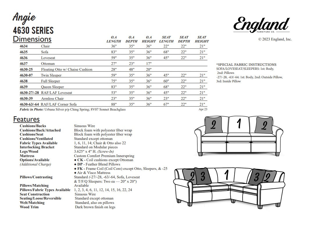 Angie can only be described one way Sleek, simple, and super comfortable. Its clean silhouette is achieved with a tight back, a P-shaped roll arm, and an exposed wood leg. This fashion-forward silhouette can go from understated and sophisticated to fabulous and fun with the change of a fabric. We offer a sofa, loveseat, chair, ottoman, floating ottoman chaise, and sectional, as well as twin, full, and queen sleepers in this collection.