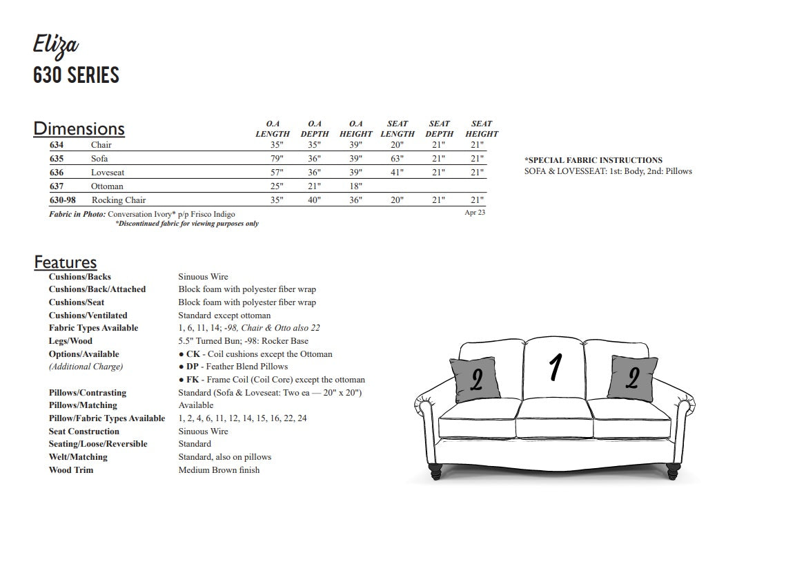 If you are looking for a petite sofa with loads of charm, then Eliza might be just what you're looking for. Its rolled panel arm, camel back, and curved front rail, give it a ton of style! We offer a matching loveseat, chair, rocking chair, and ottoman.