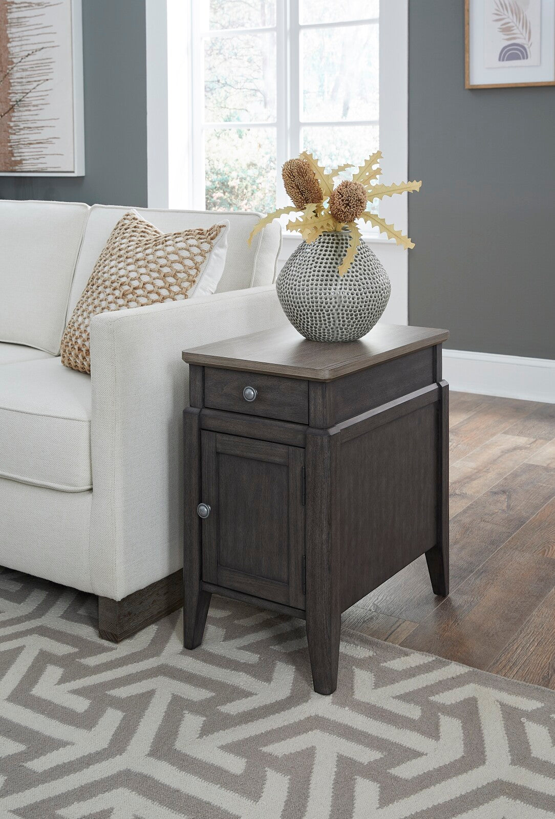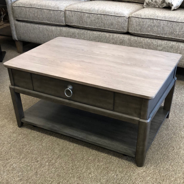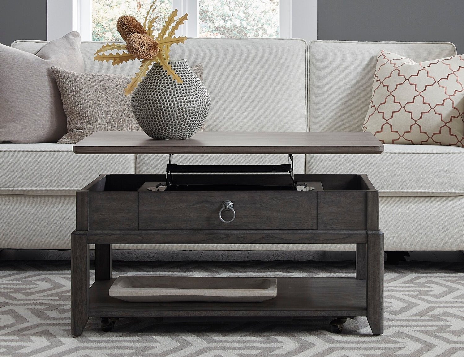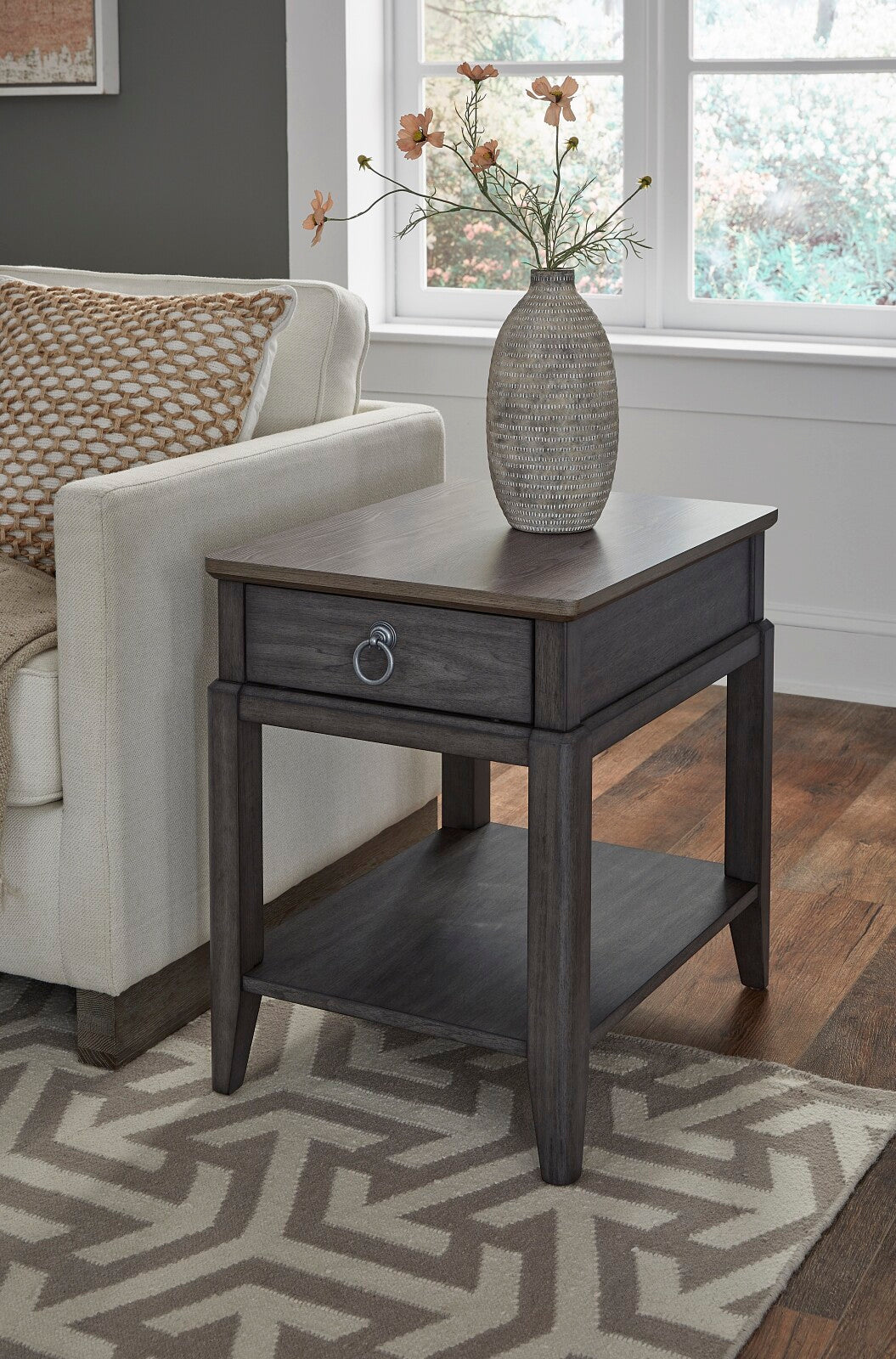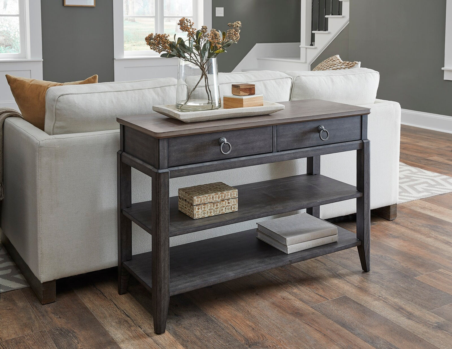 Lake Lure features a modern design with a stepped leg and beveled top edge with rounded corners. It is made of oak solids, walnut veneer, and high-pressure laminate on the tops, making it suitable for both home and office use as it protects against wear and tear. The collection has a two-tone finish: the bases are gray fog, while the tops are cathedral gray. The ring pull hardware comes with a pewter finish.