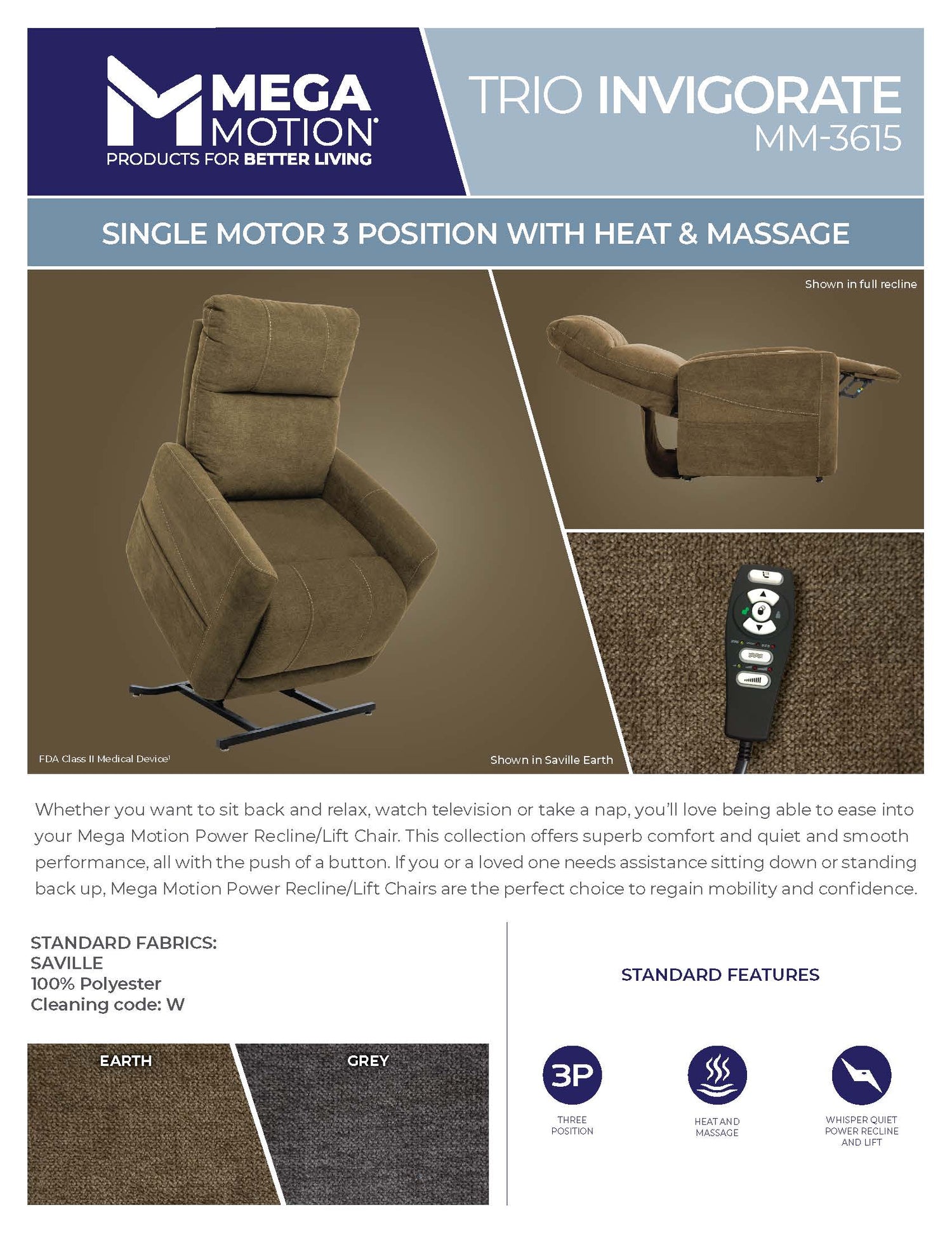 Sit back, sink in, and let the MM-3615 transport you to a world of deep relaxation. This three-position power recliner will soothe away your aches and pains, as the heat and massage package goes to work. Enjoy the feeling of ultimate luxury. With its wider seat surface and its Saville fabric available in two distinct colors, the MM-3615 is a superb combination of comfort and style for any room in your home.