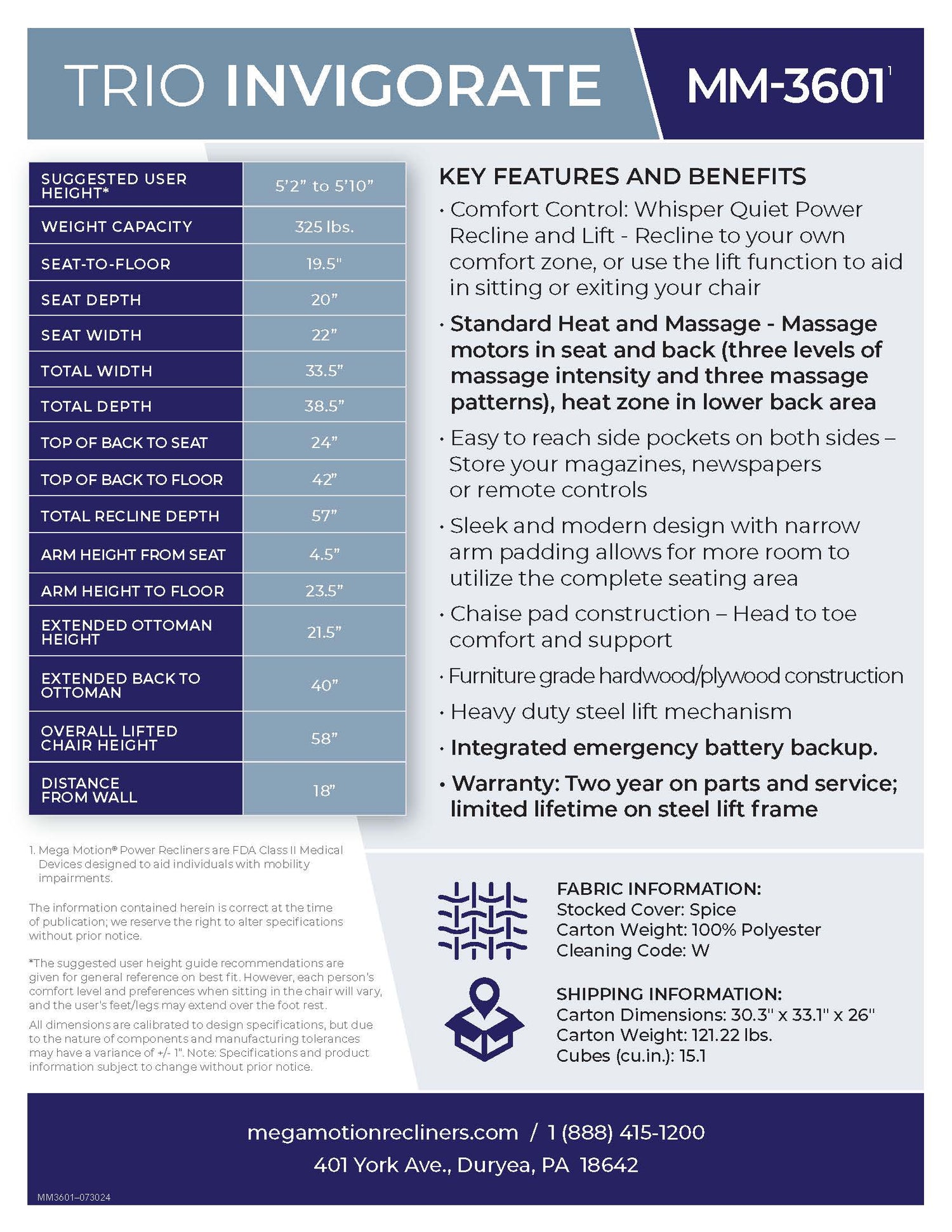 For soothing luxury in a three-position chaise lounger, the MM-3601 is sure to satisfy. Tired and achy from a long jog or work around the house? Sit back, relax, and let the heat and massage package ease your pain and troubles away. Available in two colors with Spice fabric, the MM-3601 provides optimal relaxation, making it the perfect addition to your living room décor.