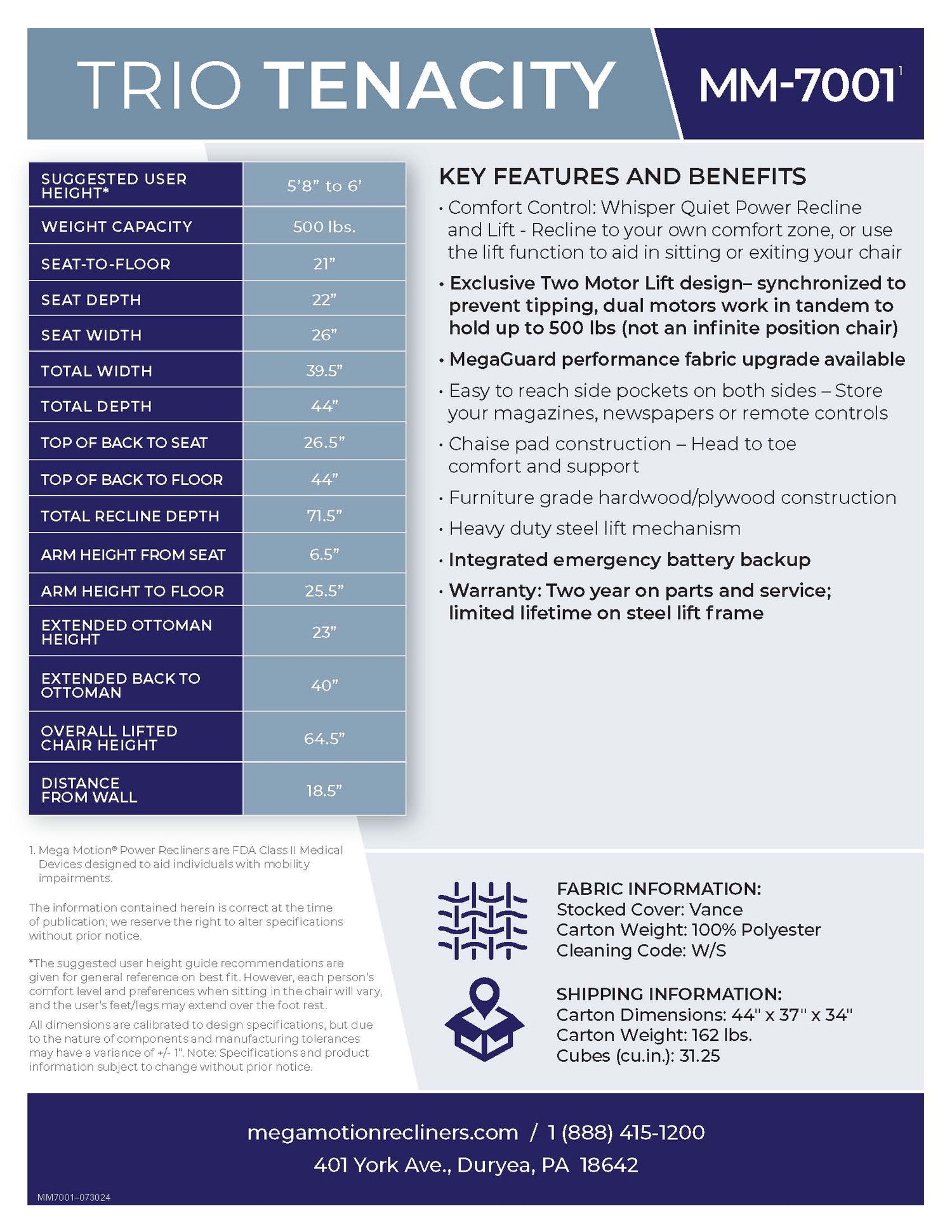 Boasting a 500-lb. weight capacity, the MM-7001 is durable, reliable, and has 49 foam encapsulated pocketed coils in the seat for supreme comfort. This three position recliner’s chaise pad construction and heavy-duty steel lift mechanism allow for ultimate support and stability. A standard heat and massage upgrade is available, as are MegaGuard® performance fabrics.