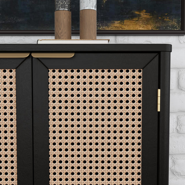 Painted black finish for a clean lookAuthentic and sustainably harvested natural cane on the door frontsSophisticated, brass hardwareUpper storage shelf provides ample space for storing bar necessities