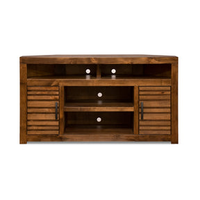 The Sausalito 52" Corner TV Stand, crafted from Knotty Alder with a rich whiskey finish, offers a sleek design that fits neatly into corners. It supports TVs up to 55" while providing ample storage for media components. This stand highlights the natural beauty of wood, adding a distinctive style to any home.